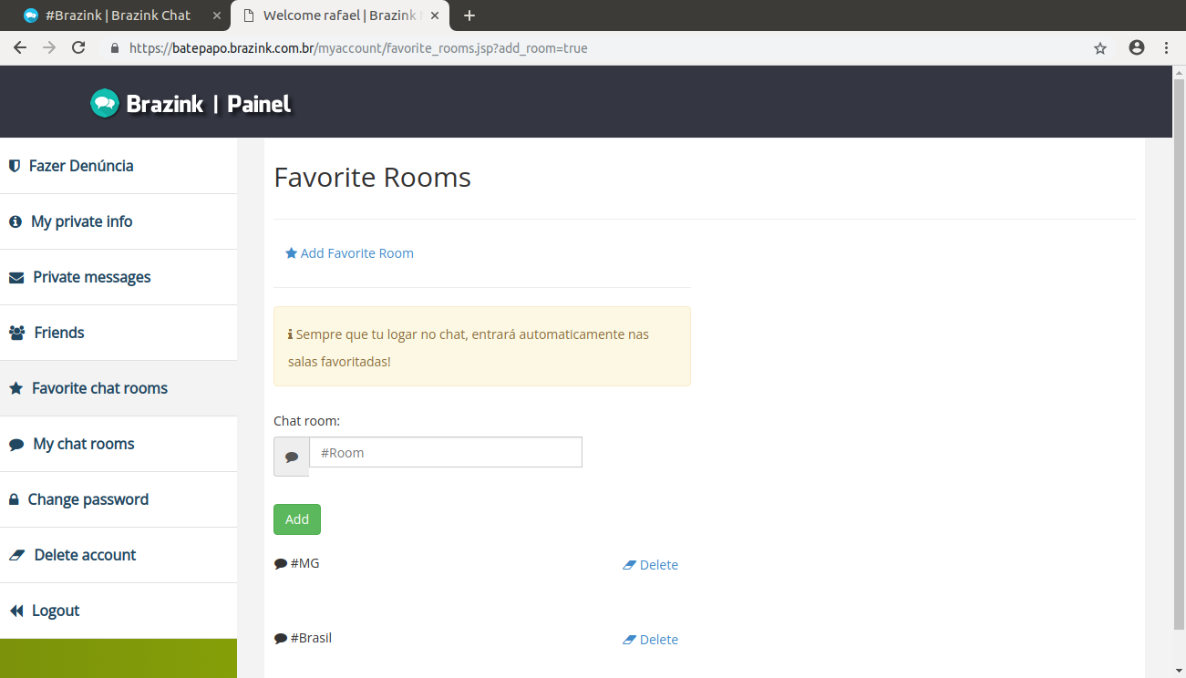 Estando logado em sua conta pelo batepapo.brazink.com.br, selecione o menu "My chat rooms".